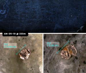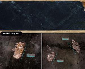 Figure 6: Drill core from hole AN-25-10 at 233 meters, showing disseminated awaruite (nickel-iron alloy) in serpentinized peridotite (top); photomicrographs of awaruite grains up to ~350 microns in size (bottom).