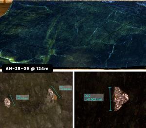 Figure 2: Drill core from hole AN-25-09 at 124 meters, showing disseminated awaruite (nickel-iron alloy) in serpentinized peridotite (top); photomicrographs of awaruite grains up to ~300 microns in size (bottom).