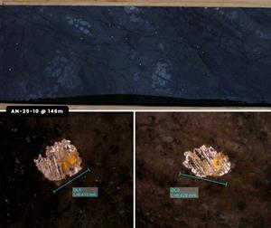 Figure 5: Drill core from hole AN-25-10 at 146 meters, showing disseminated awaruite (nickel-iron alloy) in serpentinized peridotite (top); photomicrographs of awaruite grains up to ~500 microns in size (bottom).